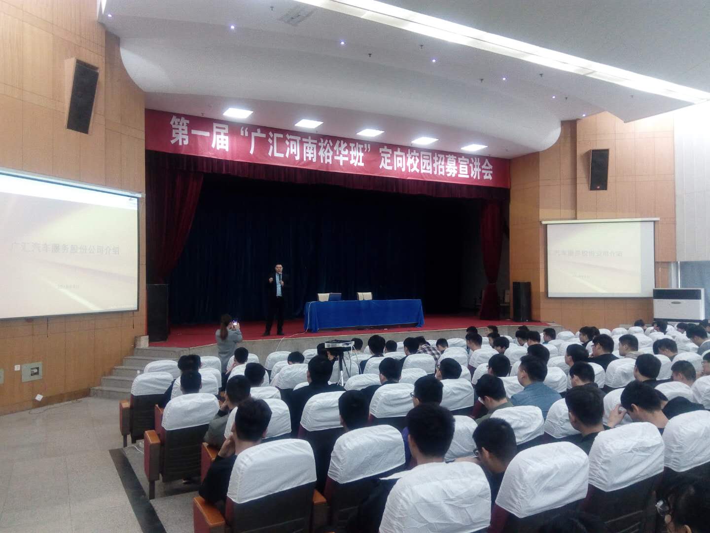3月20日下午,第一届“广汇河南裕华班”定向校园招聘宣讲活动在航海路校区艺术中心举行,888电子游戏平台手机版2017级汽运、汽电、汽营、车身修复等专业近300名学生参加。