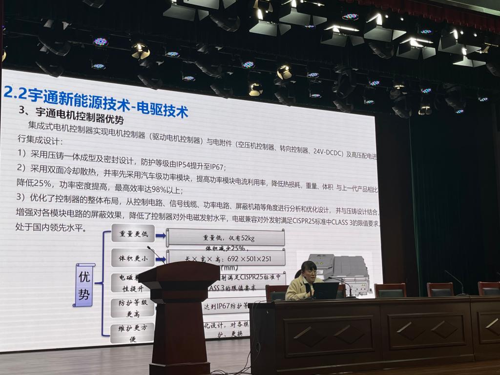 两位专家从新能源汽车发展概况入手,介绍新能源汽车的分类和关键技术,通过图片、视频和PPT等形式重点展示了宇通车载能源技术、电驱动技术、燃料电池技术等方面的最新技术成果与发展方向,对宇通智能网联汽车技术布局及无人驾驶“小宇”车辆也进行了详细的介绍,并且鼓励同学们努力学好专业知识,扎实自身基本功,树立正确的行业观和价值观,做好未来职业规划。