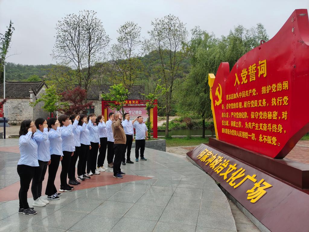 在何家冲政治文化广场,全体党员在888电子游戏平台手机版党总支书记周成林的带领下重温了入党誓词。
