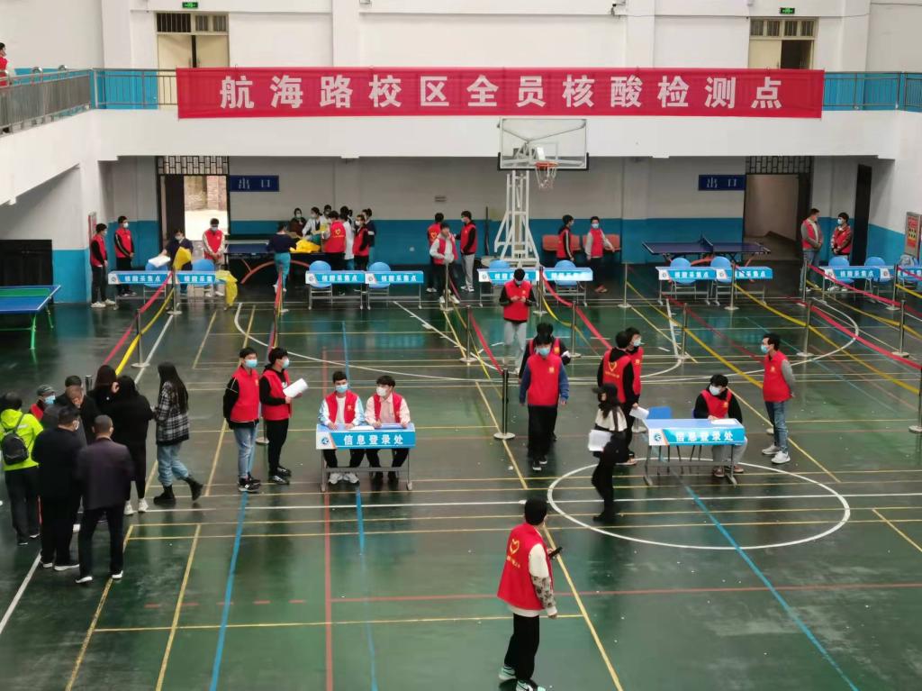 为筑牢新冠安全屏障,确保校园安全,888电子游戏平台手机版志愿者们协助医护人员为航海路校区在校师生进行全员核酸检测工作。活动现场,志愿者们为师生们提前分拣条形码、引导在场人员全程佩戴口罩、检测过程中有序排队、并协助录入和登记条形码,确保了航海路校区2700余人的核酸采样工作圆满完成。