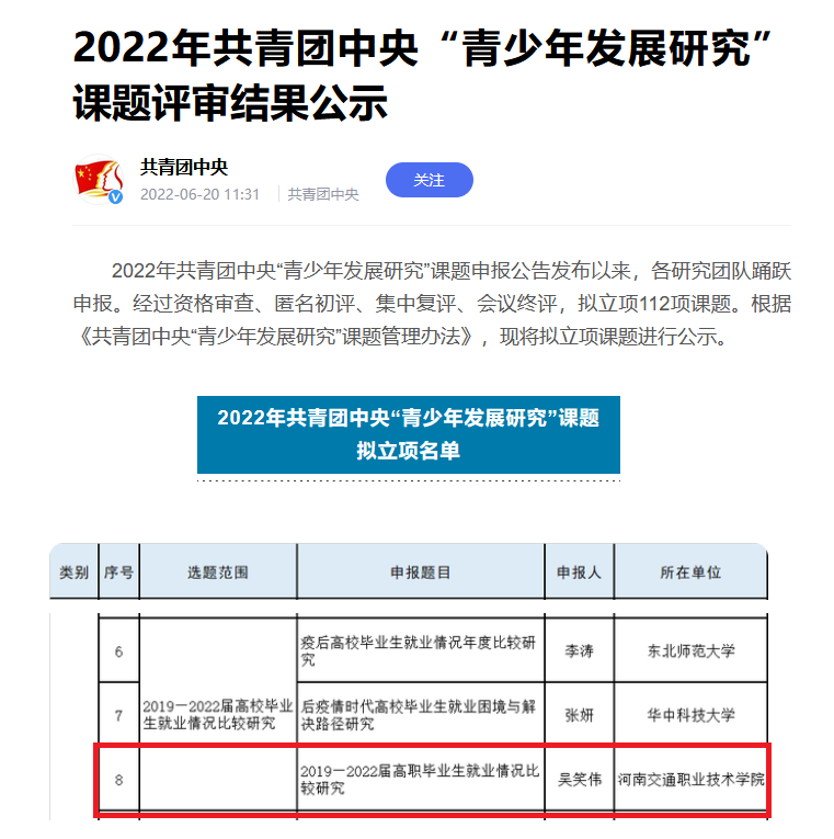 近日,共青团中央发布了《2022年共青团中央“青少年发展研究”课题拟立项名单》,888电子游戏平台手机版吴笑伟教授申报的《2019-2022届高职毕业生就业情况比较研究》成功入选。此次立项的课题是共青团中央最高级别部级课题,全国仅一所高职院校、河南仅一所高校入围,课题入选填补了学校、河南省高校、全国职业院校团中央课题立项空白,标志着我校“青少年发展”方向的科研水平已跻身全省前列。