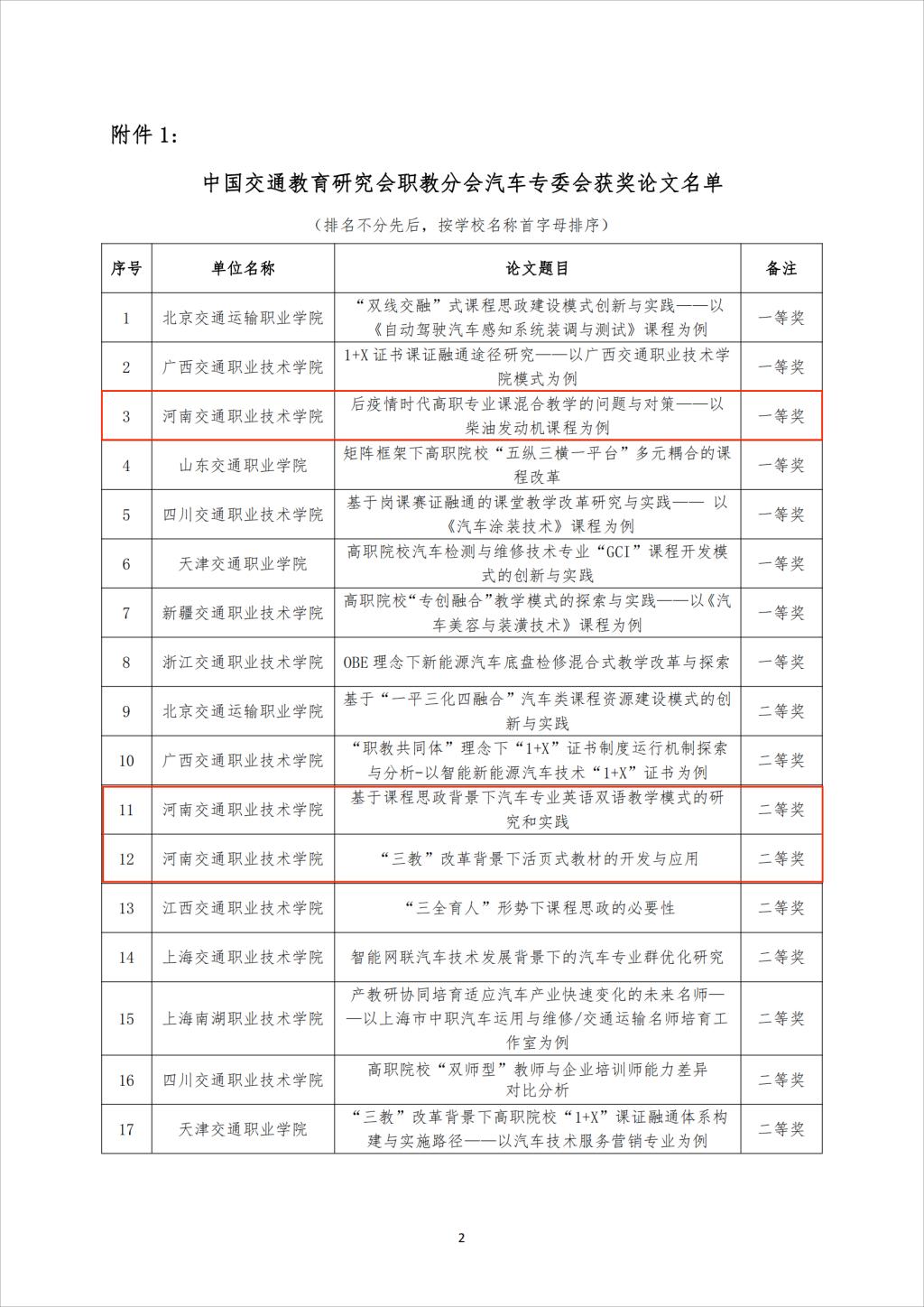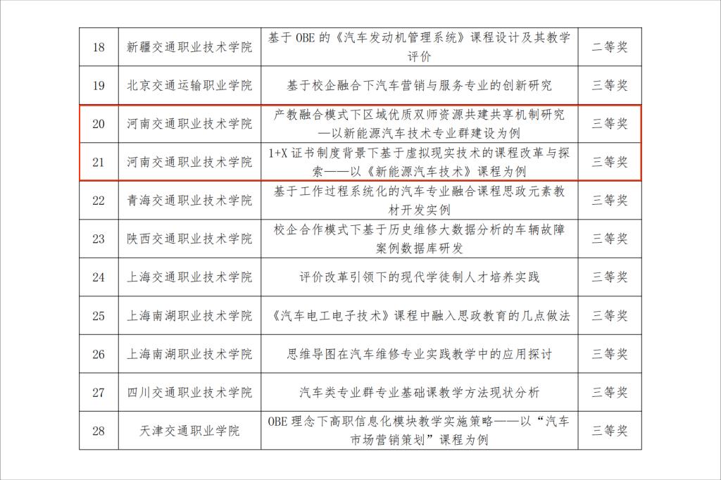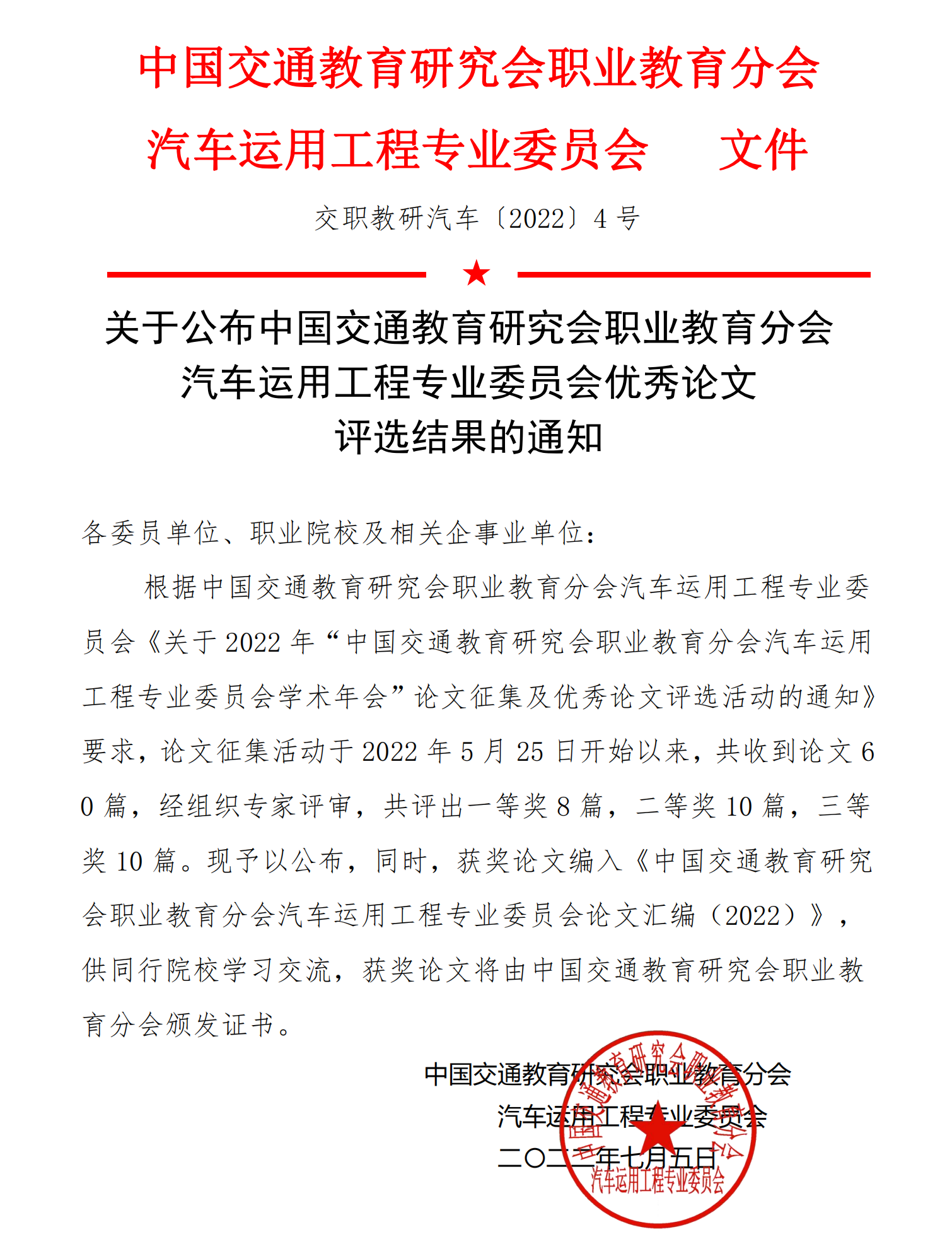 7月13日,中国交通教育研究会职业教育分会汽车运用工程专业委员会公布优秀论文评选结果,我校荣获一等奖1篇,二等奖2篇,三等奖2篇。