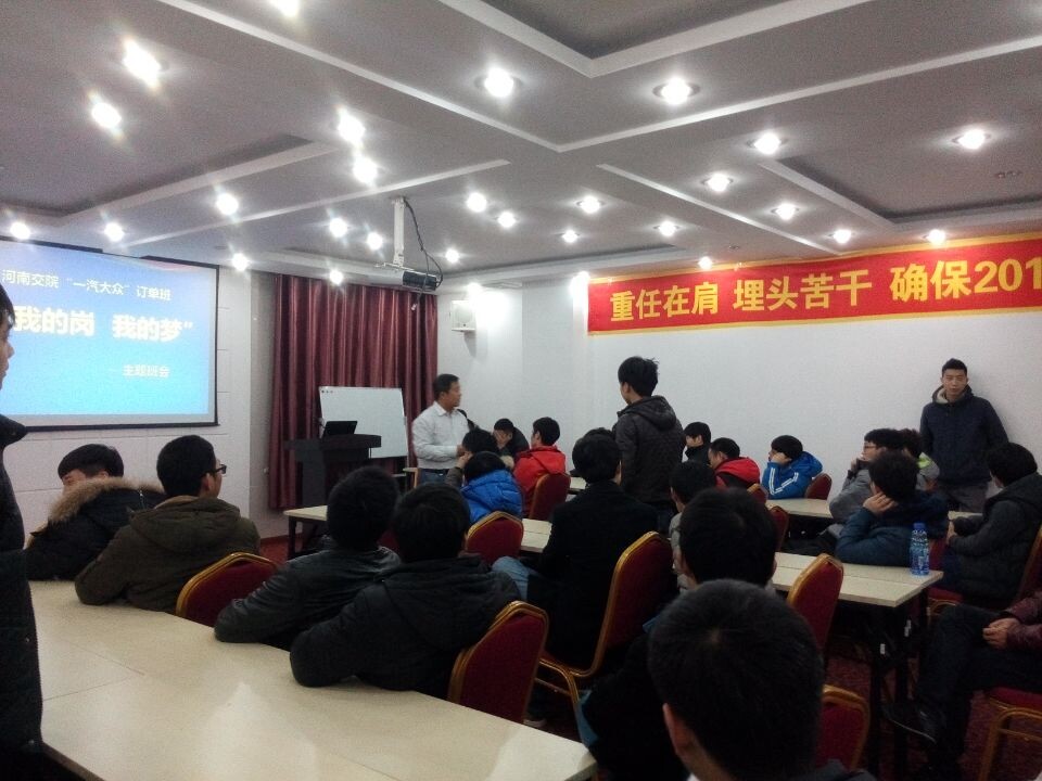 11月23日,888电子游戏平台手机版“一汽大众”订单班学员在长春实习驻地会议室举办了“我的岗我的梦”主题班会活动。