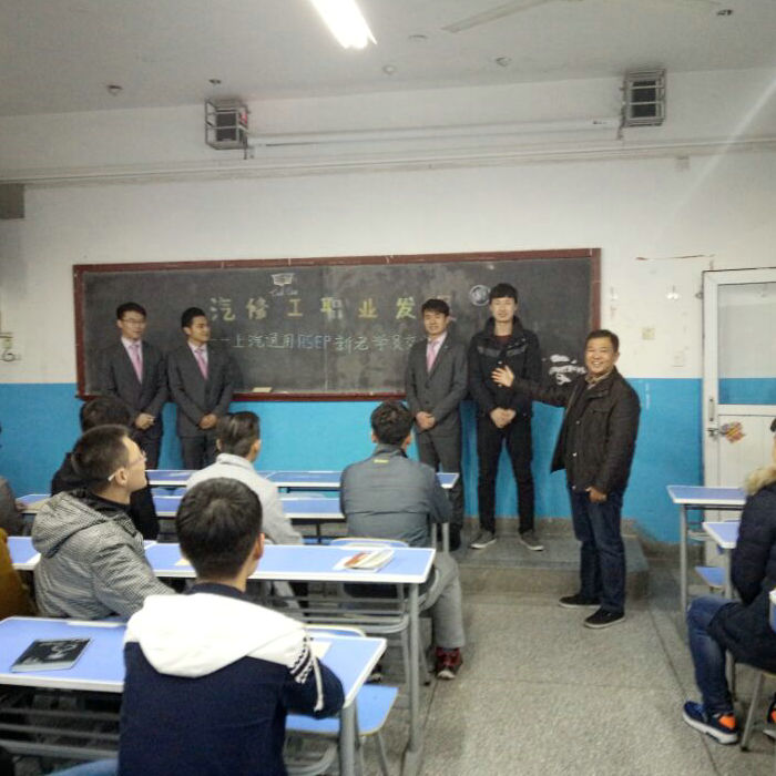 参加本次活动的老学员包括从事前台服务接待工作的吴伟康、王树川、王琦和在从事车间维修工作的吕利辉四位同学,其中吴伟康同学作为我院2013届上汽通用ASEP班毕业生,通过几年来的不懈努力,已经从一名普通的汽修工晋升为新凯迪汽车销售服务有限公司的SA(服务经理),交流过程中,他首先以自己的努力经历和学习过程为例,从4S店的岗位设置、工作职责、职业能力发展、晋升途径等多个方面为同学们进行了阐述和沟通,新学员们也就自己关心的问题比如工资待遇、工作是否辛苦、学习培训多不多吗、如何转岗等等提问交流沟通,其他几位同学也就同学们感兴趣的问题进行了热烈的讨论,并给新学员们留下联系方式以便随时联系。