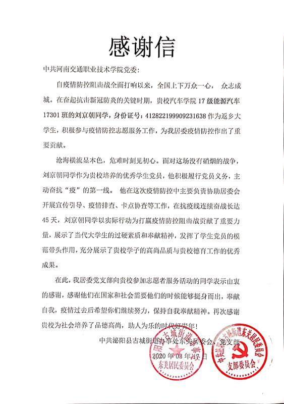 近日,我校党委收到来自中共泌阳县古城街道办事处东关委员会、党支部的一封感谢信。感谢信里面的主人翁是我校888电子游戏平台手机版2017级能源汽车17301班学生刘京朝。这封信中记录了刘京朝同学积极响应政府号召,在家乡和社区工作人员一道共抗疫情的点滴行动,向学校表达了立德树人,教书育人的感激之情。