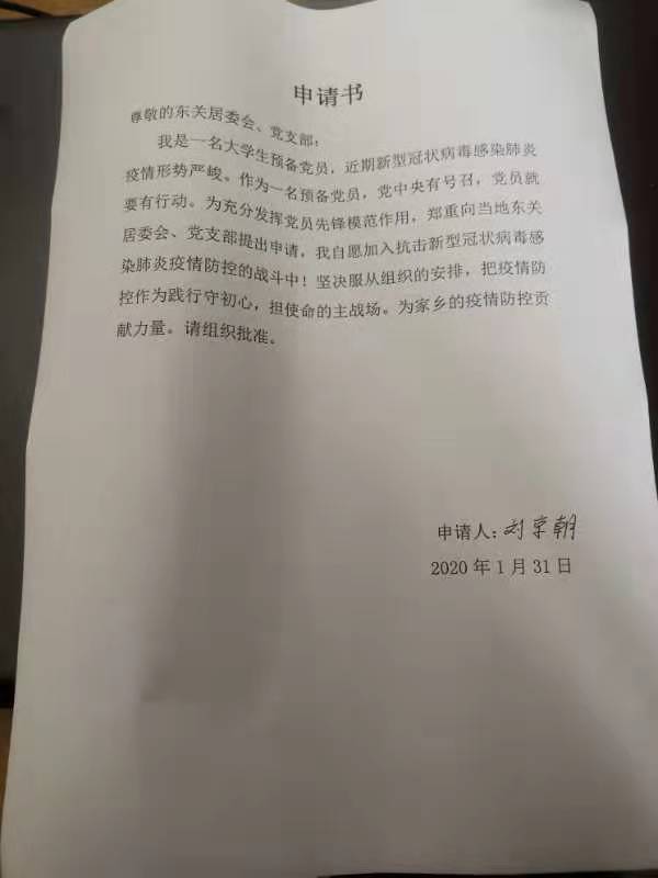 信中写道:疫情发生后,刘京朝同学1月31日写下申请书,隔天早上便到社区党支部报到,成为古城街道办事处抗击疫情的一名“排头兵”。他总是冲在一线,展示着新时代靑年的责任与担当。卡点值班,他不惧严寒,日夜坚守,主动申请去风口较大的泌阳县烈士陵园卡点执勤:出入管控,他严格认真,一丝不苟;他仔细学习防控知识,跑前跑后分发防疫安全知识宣传单,普及疫情防控知识,在抗疫战线连续奋斗长达45天,刘京朝同学以实际行动为打赢疫情防控阻击战贡献了重要力量,展示了当代大学生的过硬素质和奉献精神,发挥了学生党员的模范带头作用,充分展示了贵校学子的高尚品质与贵校德育工作的优秀成果。
