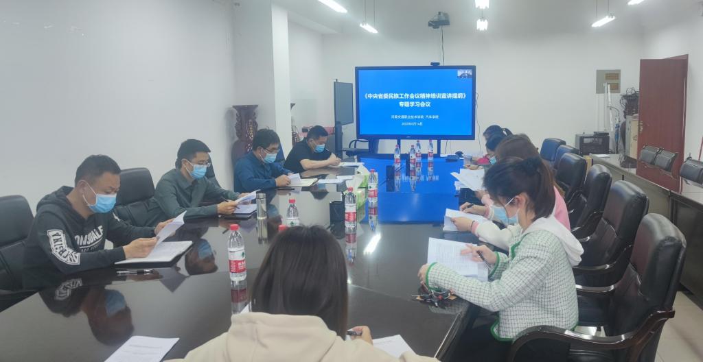 会议组织全体与会人员认真学习了《中央、省委民族工作会议精神宣讲提纲》,传达了《中共河南省委高校工委办公室、河南省教育厅办公室关于开展铸牢中华民族共同体意识主题教育工作的通知》《中共河南交通职业技术学院委员会关于印发<河南交通职业技术学院开展铸牢中华民族共同体意识主题教育活动实施方案>的通知》等文件精神,对888电子游戏平台手机版开展铸牢中华民族共同体意识主题教育活动进行了安排部署。