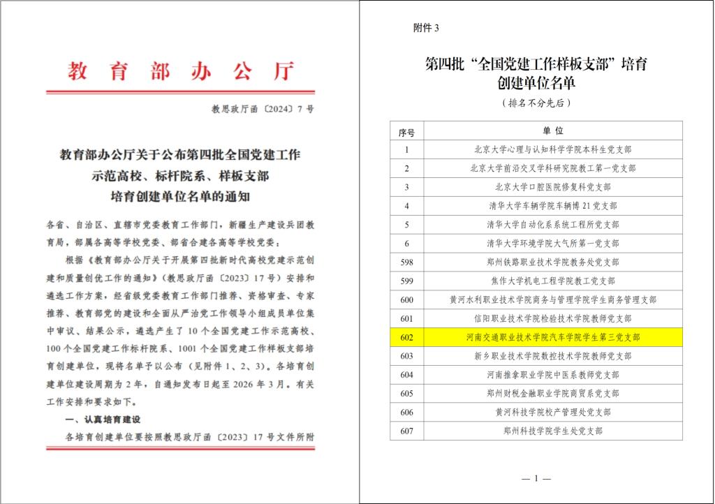 近年来,在学校党委的坚强领导下,888电子游戏平台手机版党总支深入开展新时代高校党建示范创建和质量创优工作,学生第三党支部秉承“高质量的党建引领高质量的教育发展”理念,积极打造学生党支部品牌,聚焦基层党支部工作“七个有力”的建设标准,打造了“3331”党建工作机制,创新实施“红色方向盘”党建工作模式,在思想政治建设、志愿服务、社会实践、技能竞赛等方面取得显著成效。先后荣获“全省高校省级样板党支部”“全省高校基层党支部抓党建创新典型案例奖”“省交通运输厅党组星级支部示范点”,多次被学校党委授予“优秀基层党组织”。学生志愿服务团入选团中央乡村振兴“笃行计划”专项行动全国性示范实践团队、河南省大中专学生志愿者暑期文化科技卫生“三下乡”社会实践活动全国重点团队。1名入党积极分子入选全国“新时代好少年”,4名学生入党积极分子、团员青年荣获全国职业院校技能大赛“汽车故障检修”“汽车营销”两个赛项一等奖。