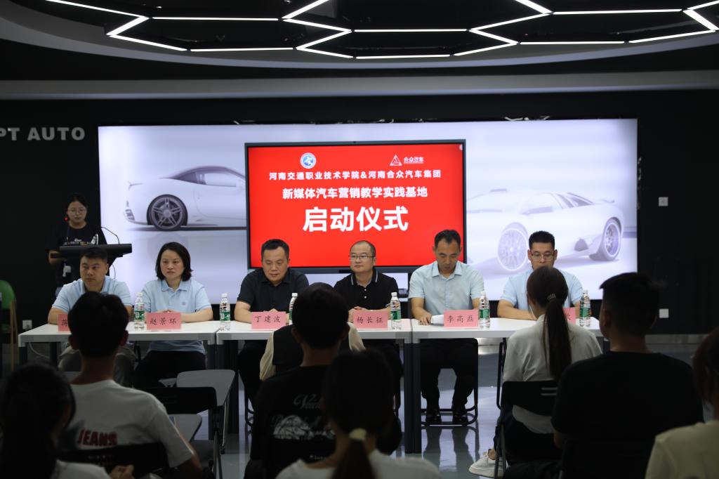 9月5日上午,888电子游戏平台手机版与河南合众汽车集团共同举办了“携手数智营销,校企共建新媒体汽车教学实践基地”启动仪式。河南合众明德汽车销售服务有限公司总经理丁建波,汽车新媒体总监赵景环,汽车新媒体经理蒋尔宇,汽车金牌主播付迎钦,888电子游戏平台手机版副院长杨长征等出席仪式,汽车营销专业全体教师和2023级汽车营销全体学生参加启动仪式。