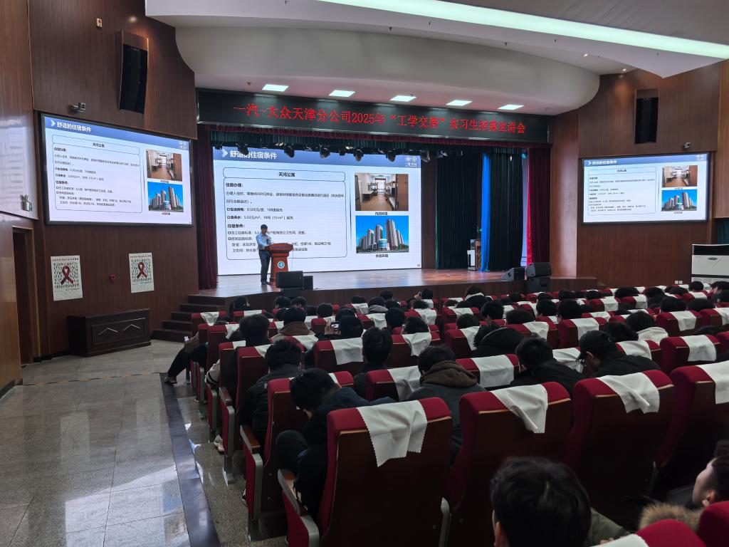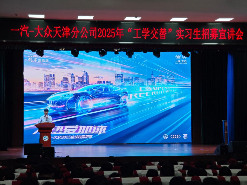 12月19日,一汽大众天津分公司在航海路校区艺术中心报告厅成功举办工学交替实习生招募宣讲会,600余名师生参会。