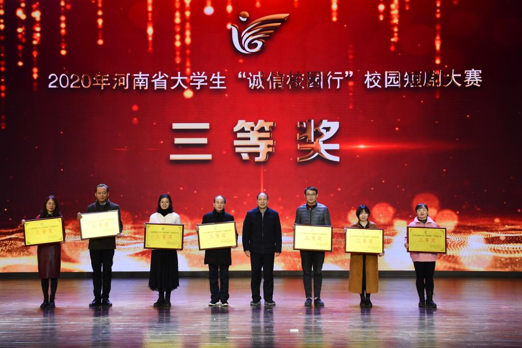 12月14日-16日,河南省大学生“诚信校园行”校园短剧总决赛在河南科技大学举行,我院创作并推荐参赛的短剧《信的主人》以优异的成绩获得河南省大学生“诚信校园行”校园短剧大赛G赛区一等奖,总赛区三等奖,我院李函霄老师荣获优秀导演奖,张景昀老师荣获优秀指导教师奖,尚嘉欣同学荣获优秀演员奖。