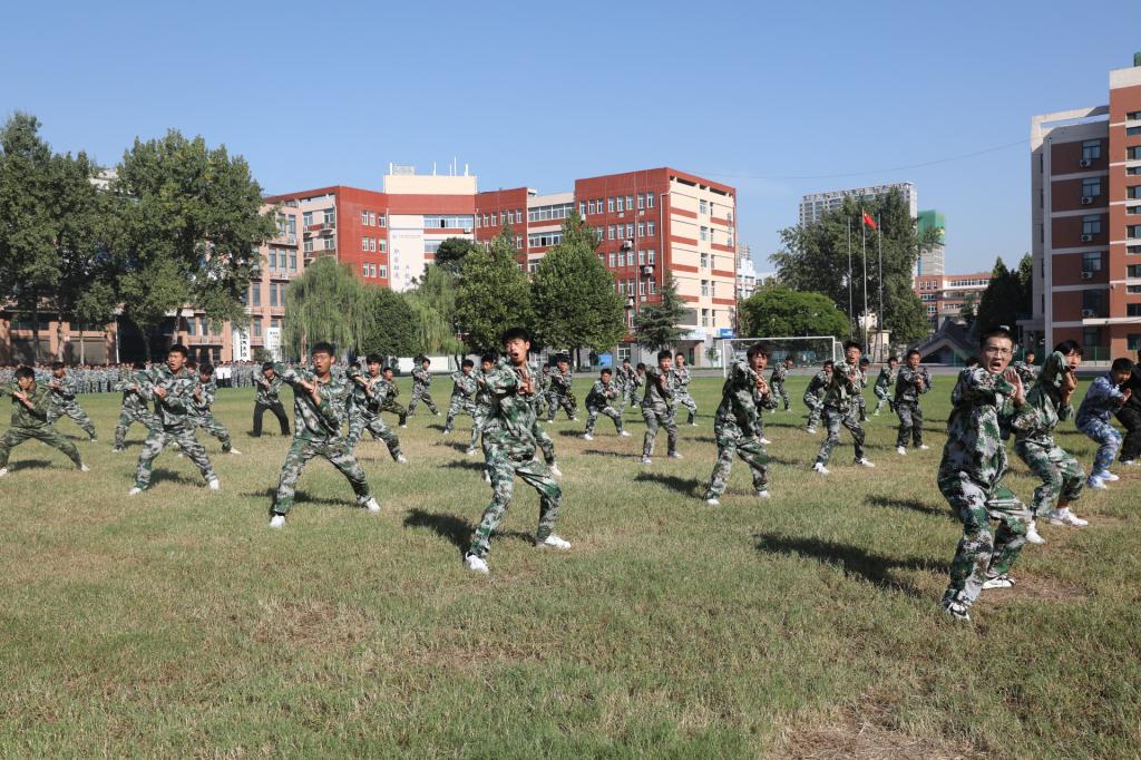 在操场举行的大学新生军训汇报演出中,一千多名刚刚步入校园的新生们以饱满的热情和出色的成果展示,展现了他们的朝气与活力。在汇报演出中,同学们不仅仅带来了部队队列动作基础-单个军人队列动作的表演,也有由81名女生所组成的方阵带来的匕首操表演,以及由汽车营销工程机械能源汽车专业的男生组成的方阵带来的军体拳表演,整个汇报演出是新生们在为期两周的紧张军训后的集中展示,也是他们适应大学生活并融入集体的重要环节,这次成果演出不仅展示了新生们身心力量的成长,也展现了他们团结协作、追求卓越的精神风貌。