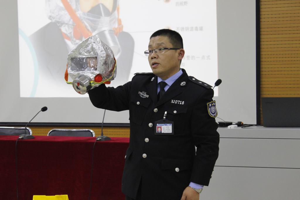 讲座内容分为“为什么会发生火灾?”、“单位如何预防火灾发生 ”、“单位火灾防控措施”三部分。曲教员结合各种火灾案例讲述消防安全的重要性,给在场的教职工树立了公共消防安全意识。他还全面深入讲解了防火要求及处理方法,紧急突发情况时如何进行逃生疏散,多层、高层建筑火灾预防及逃生方法,并向大家介绍了“灭火”、“逃生”、“自救”等消防应对措施。最后他还演示了灭火器、逃生锤、防毒面具等消防设施使用方法。