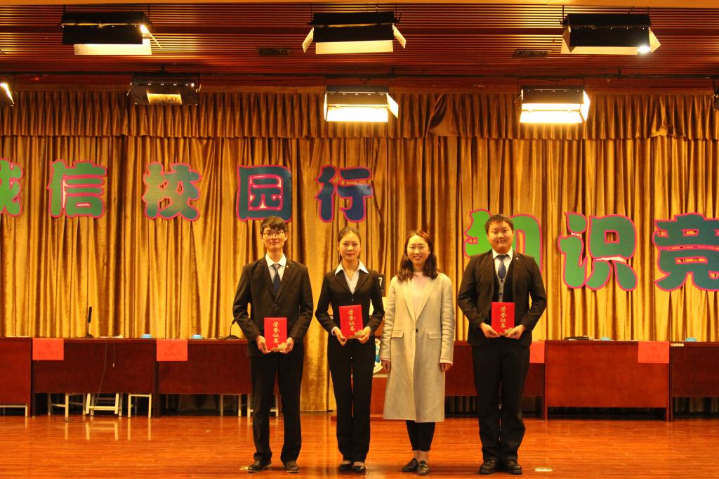 为了增强大学生金融风险防范意识和金融安全知识,防止不良“校园网贷”等金融诈骗现象的发生,2017年12月5日,新校区图书馆二楼图文中心,我院学子在学工处举办的“诚信校园行”学生资助政策知识竞赛总决赛中获得优异成绩。