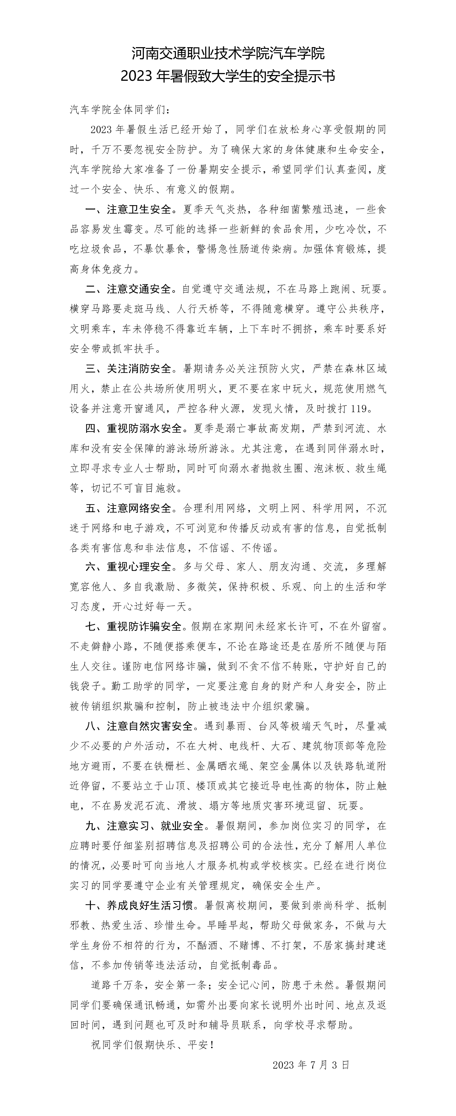 河南交通职业技术学院888电子游戏平台手机版2023年暑假致大学生的安全提示书