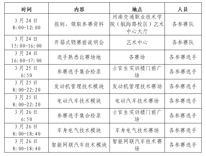 根据《河南省教育厅办公室关于举办2022年河南省高等职业教育技能大赛的通知》(教办职成〔2022〕102号)文件和《关于公布2022年河南省高等职业教育技能大赛赛项承办学校的公告》文件要求,2022年河南省职业院校技能大赛高职组“汽车技术”赛项由河南交通职业技术学院承办。经报省教育厅同意,赛项定于2023年3月24日报到,25日-26日比赛。现就报到事宜通知如下:
